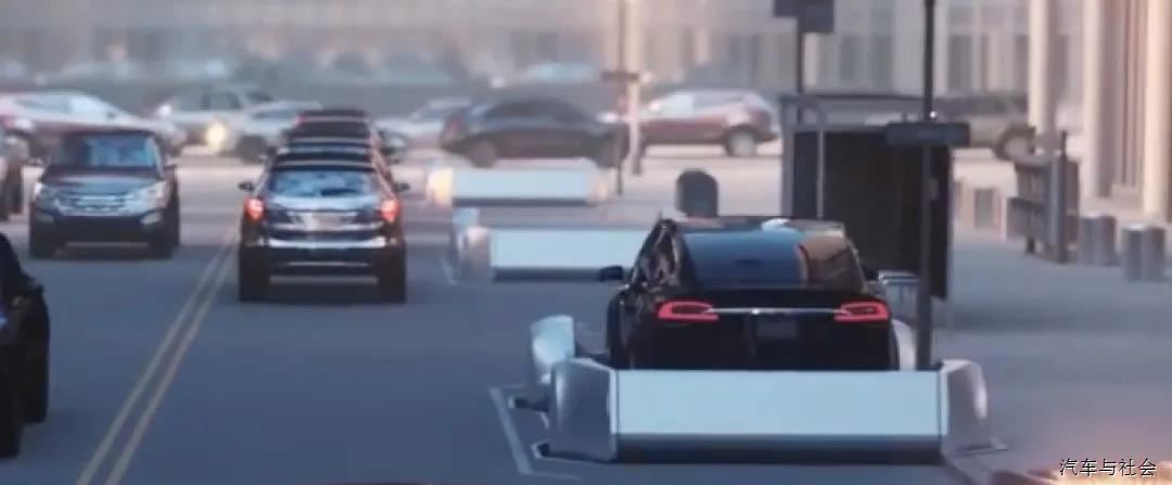 上图就是他老人家的大胆设想,地下交通系统上运行的就是这样萌萌的小型巴士,站点设置在路面,占地仅仅一个普通车位的面积。
